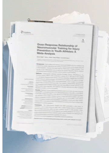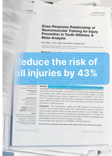 Every training session includes 5 or more deceleration/ landing stabilization movements, and lunges, hams and calf exercises as prescribed by meta-analytic research examining the most effective programs studied in the past 25 years. New exercises in one or more of these categories are introduced every other session.